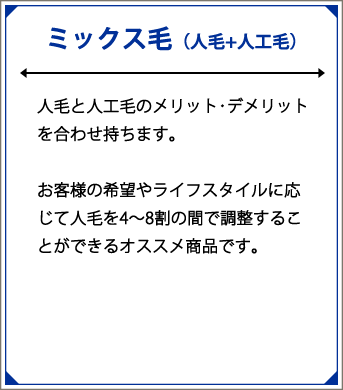 ②毛髪は「人毛」「人工毛(合成繊維)」「ミックス毛(人毛+人工毛)」の3種類。